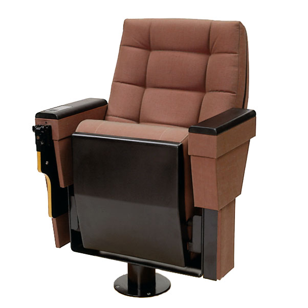 Luxury conference seat on a central leg, featuring a plastic shell on the rear of the back rest and the underside of the tipping seat unit. The decorative stitching on the back rest and seat unit and the special finish on the arm-rests with a leather end-piece give this seat a character all of its own. Options available include translating equipment incorporated in the arm-rest underneath a sliding door and a fold-away writing tablet.