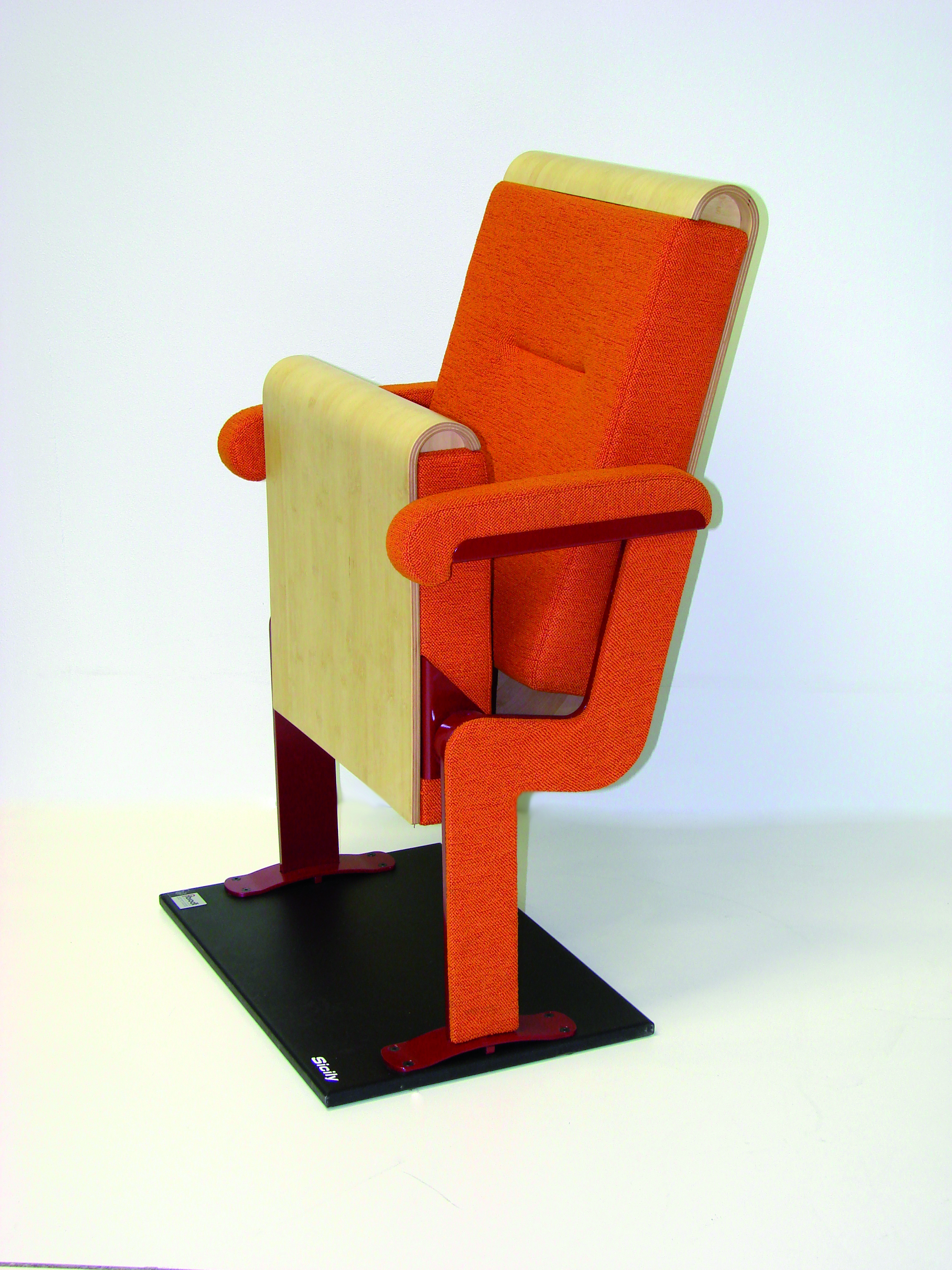 “Round-shaped” theatre seat. The lateral supports are made from one piece and serve as fastenings for both the back rest and seat. The back and seat are finished in curved wooden veneered board. Numerous trim and finishing options: